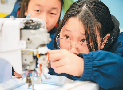 重慶市璧山中學學生在服裝工作坊興趣社團改造舊衣服。
