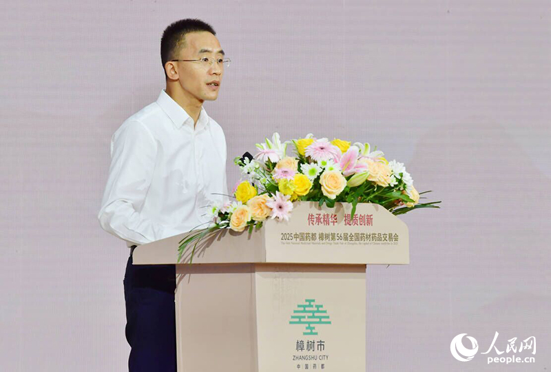樟樹第56屆全國藥材藥品交易會開幕式上,樟樹市委書記曾海向參會的嘉賓介紹樟樹中醫藥的發展歷程。人民網記者 時雨攝