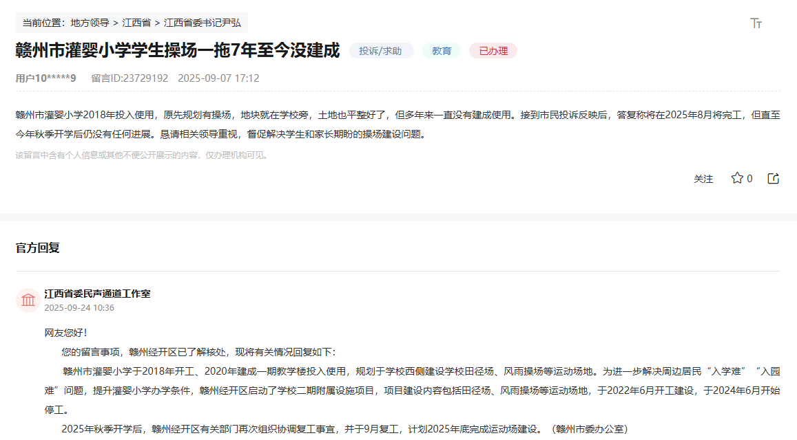 關於反映贛州市灌嬰小學投用多年,校內田徑場、風雨操場等運動場地仍未完工啟用的問題。經贛州經開區黨工委核辦,已組織協調學校二期附屬設施項目復工,預計2025年底完成運動場地建設。