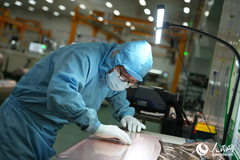 近日,記者穿上防塵服,“全副武裝”走進孚能科技(贛州)股份有限公司(簡稱孚能科技)動力電池智能化生產車間。車間內,全流程自動化設備馬力全開,一塊塊銀色軟包動力電池在生產線流轉中完成組裝、成型。