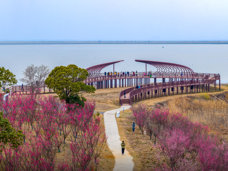2月12日,江西省九江市永修縣獅子山觀鳥點梅花悄然綻放,與遠處湖中候鳥相映成趣,構成一幅如詩如畫的生態畫卷。