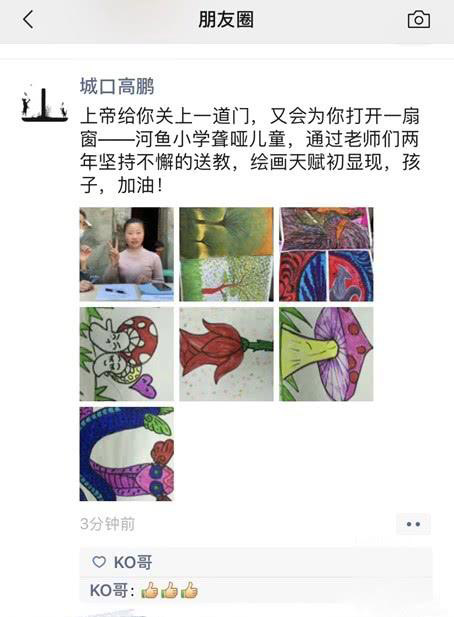5月初,高鹏在朋友圈里发了几张萍萍画作的照片,并写道:上帝给你关上一道门,又会为你打开一扇窗——河鱼小学聋哑儿童,通过老师们两年坚持不懈的送教,绘画天赋初显现,孩子,加油!