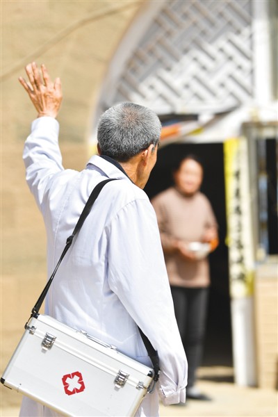 在铁头村下铁头自然村,出诊结束后的张尚保跟村民挥手告别。新华社记者 詹 彦摄