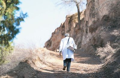张尚保背着药箱走在去石楼县铁头村巴福山自然村的路上。新华社记者 詹 彦摄