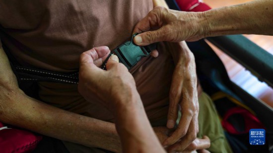 8月2日,许再霞为丈夫系好轮椅上的安全带。