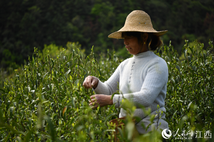 严台村的村民正在茶园内采茶。 人民网 时雨摄