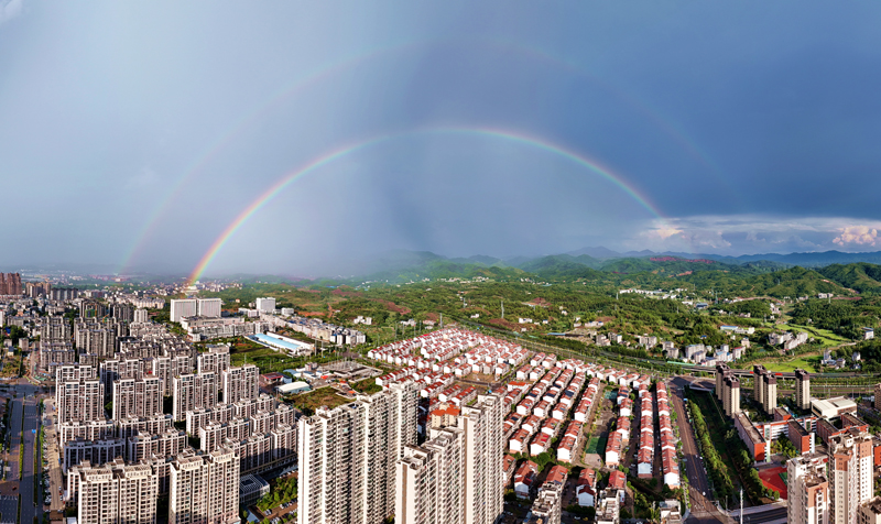 10月14日,一场大雨后,江西赣州会昌县城上空出现一道绚丽双彩虹,与远山、田园、楼宇、道路交相辉映,构成一幅美丽的秋日生态画卷。(吕春华)