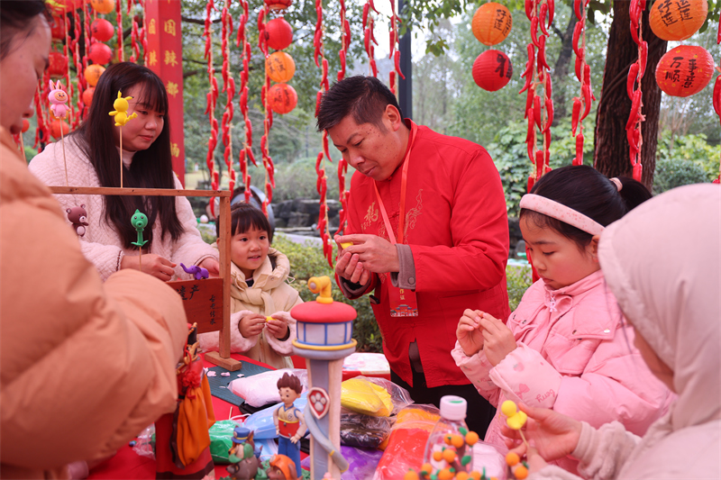 活动现场,场景丰富多元。非遗技艺展示区内,扯筒子、捆筒子等花炮制作体验吸引着好奇的游客动手尝试;一旁的糖画、捏面人等非遗手作摊位前围满了打卡的游客;“亲子湫趣园”里传来阵阵欢声笑语。这些丰富的互动,让深厚的传统年俗转化为可触摸、可分享的欢乐,描绘出一幅文旅消费的鲜活图景。