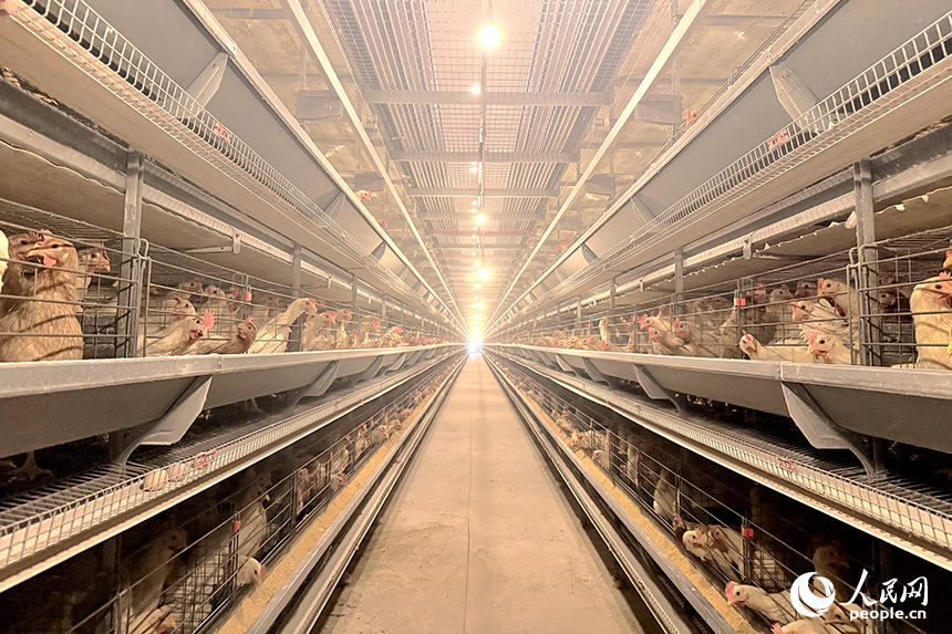 与其说是鸡舍,更准确地说是现代化养殖车间——只见数十米长的六层金属鸡笼整齐排列,数万羽浅色的蛋鸡探出头来,啄食料盒里的玉米和豆粕;车间环境干净、规整,闻不到预想中的腥臭味。