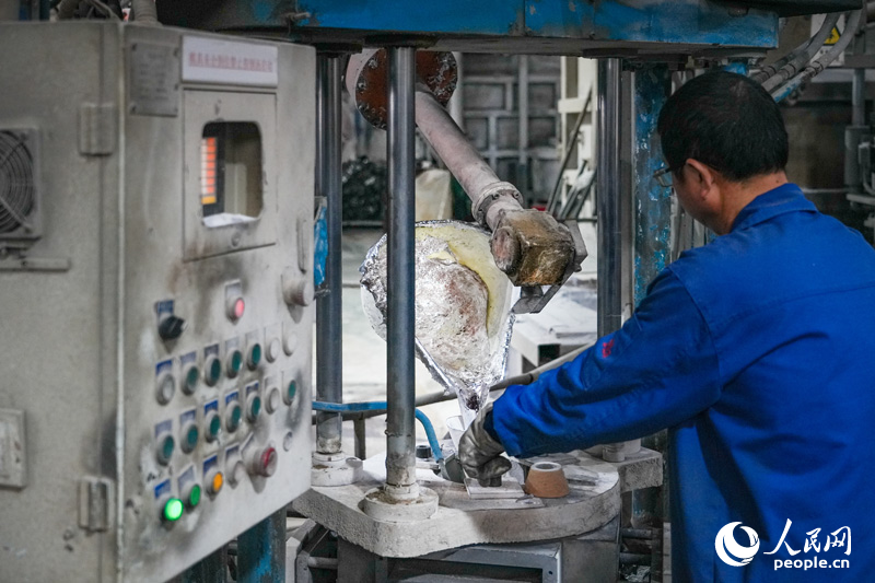 机械手将铝水注入模具。人民网 涂诗轩摄