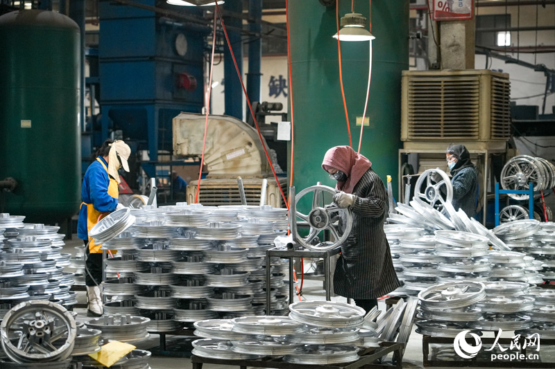 工人们正在对轮毂进行检测。人民网 涂诗轩摄