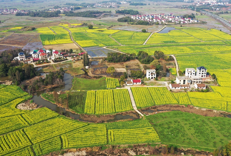 连日来,江西省抚州市东乡区虎圩乡肖家村500多亩油菜花盛开,与周围的村庄、道路相映成趣,构成一幅迷人的美丽乡村画卷。(饶方其摄影报道)