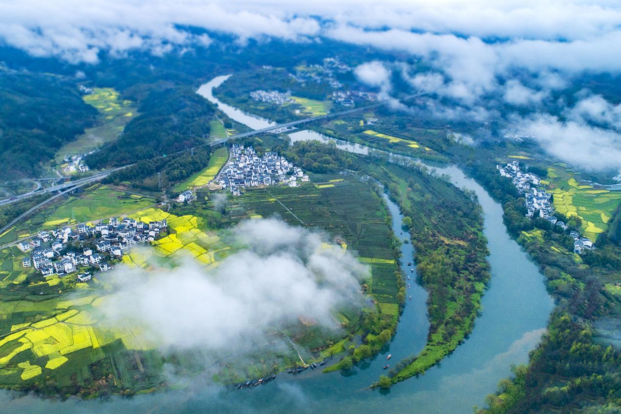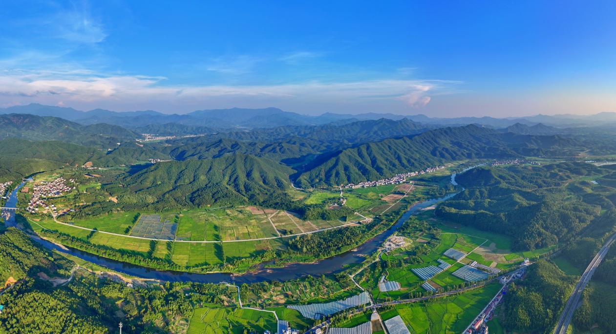 德兴市张村乡店前村一带,群山与村庄、田园、河流相映如画。朱海鹏摄