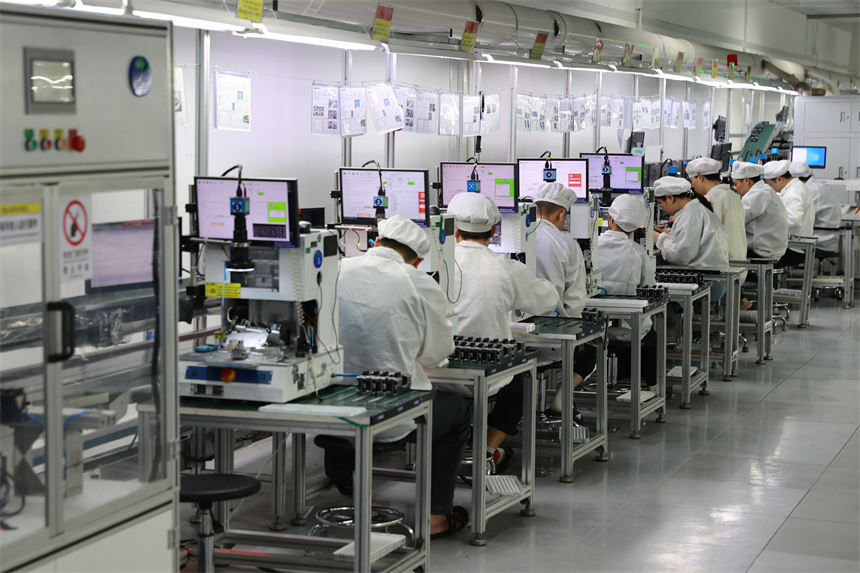 江西立讯智造有限公司生产车间内,工人正在赶制订单。 李超摄